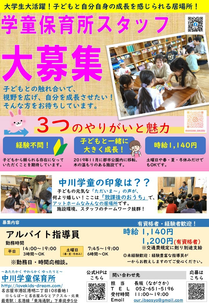 これまでの中川学童保育所の歴史と伝統を継承しながらも高い理想をもち、同僚指導員、そして保護者とも“なかま”になることができ、共に歩んでいただけるそんな方の応募をお待ちしています。
