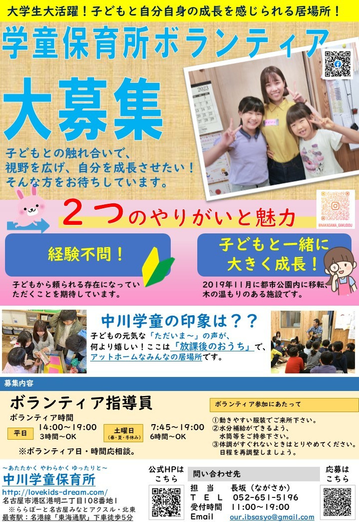 将来、保育士・教員を目指している皆さんには、貴重な経験となること間違いナシです。中川学童に関わった多くの学生さんはその夢を叶え、今、保育・教育現場で活躍しています。